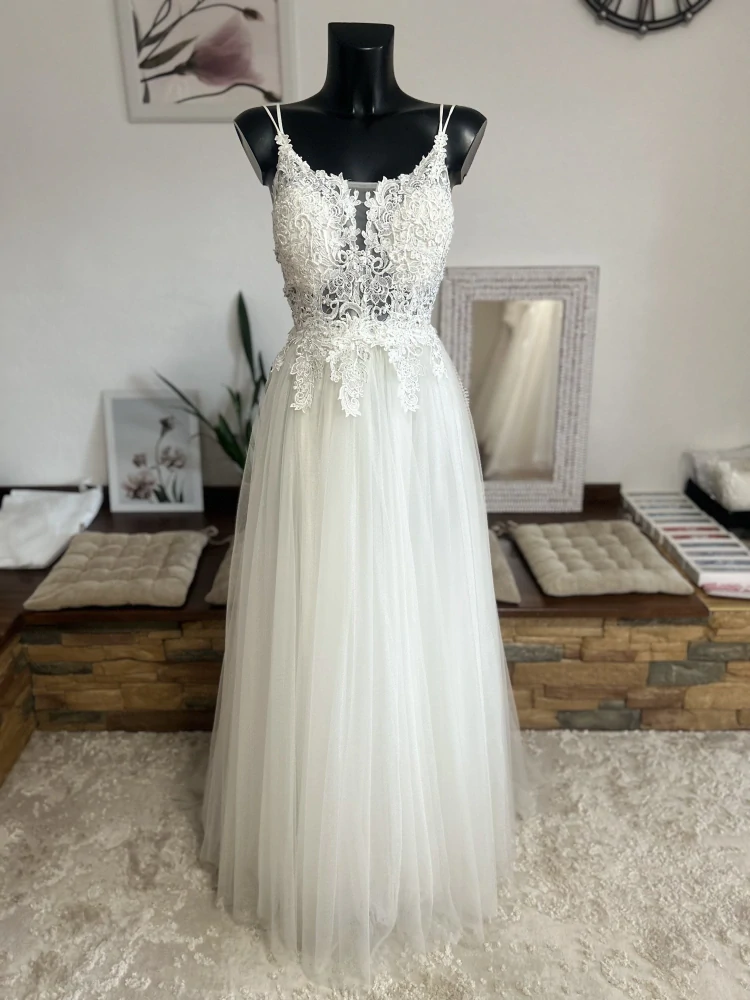 Nové svatební šaty v barvě ivory. Míry prsa 90-95 cm, pas 74-80 cm. Šaty mají rozparek na stehně. Velikost M, 38/40