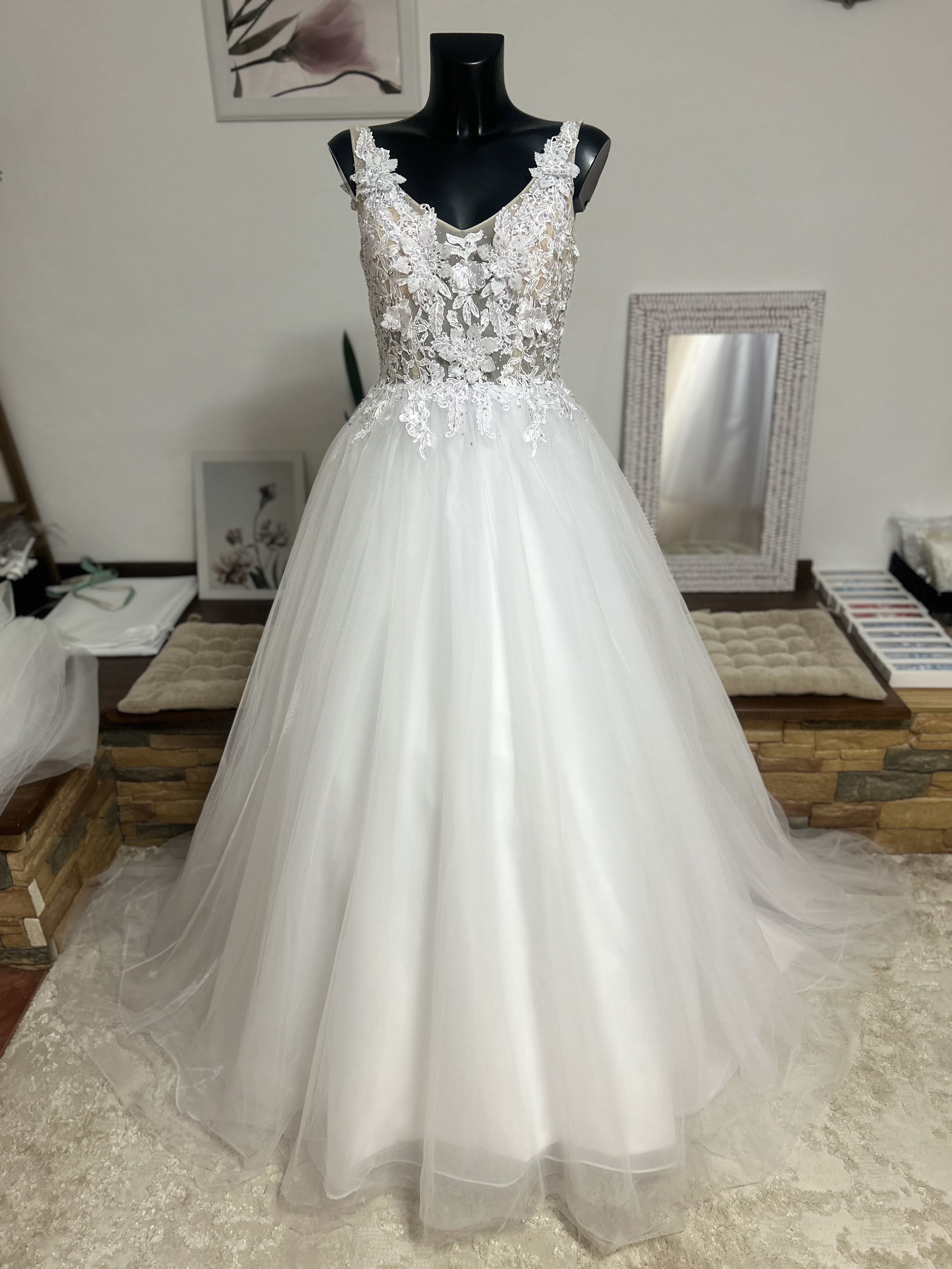 Nové bílé svatební šaty. Na focení použita spodnice H7a, není v ceně. Velikost 40. Míry prsa 95 cm, pas 76 cm.