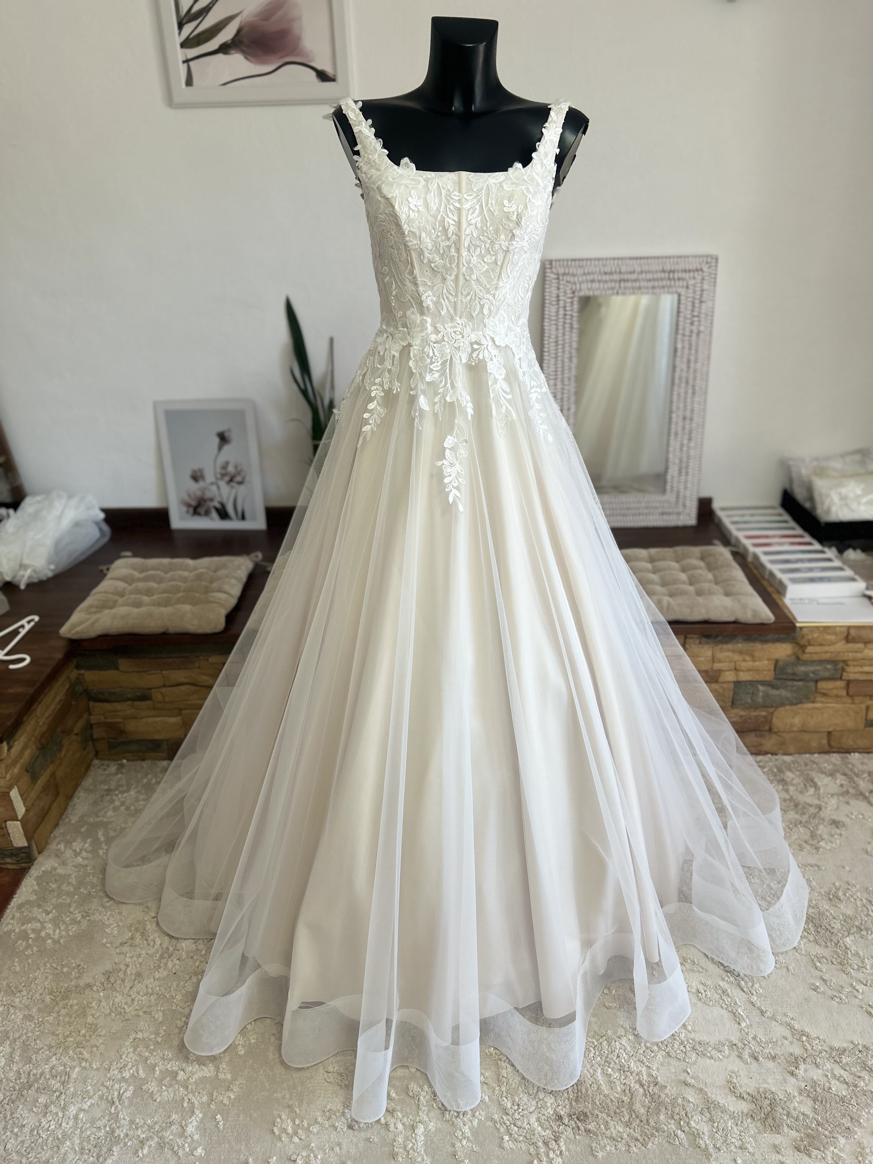 Svatební šaty v barvě do krémova, tyl je v barvě ivory. Míry prsa 72-85 cm, pas 60-70 cm. Velikost 32 až 36. Na focení použita spodnice H7a, není v ceně.